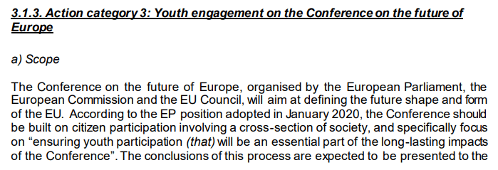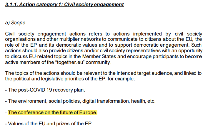 This blog can EXCLUSIVELY report on two “calls for proposals” that were made by the EP last Summer. The “calls for proposals” are an invitation for those desiring to get some EP cash to then generate engagement for “CoFoE”.
